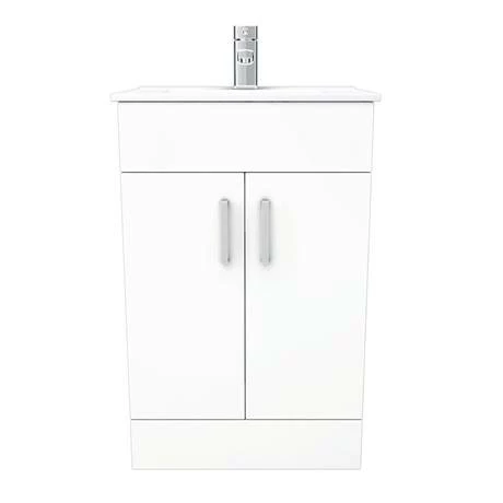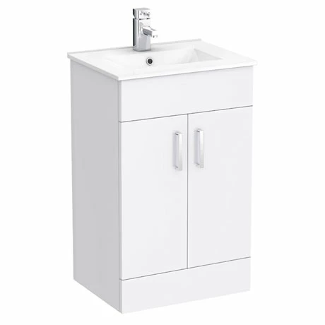 Maximise bathroom storage without compromising on style with this Toreno Small Vanity Sink With Cabinet. At just 505mm wide, this freestanding vanity unit should tuck neatly into smaller spaces such as cloakrooms or en suites. The cupboard has sleek chrome handles and practical soft close doors with plenty of room inside for bottles, towels and other accessories. Thanks to a hardwearing finish, the high quality and streamlined ceramic sink is easy to keep at its sparkling best. Why not pair this basin vanity unit with a tap from the Toreno range for a coordinated contemporary look?